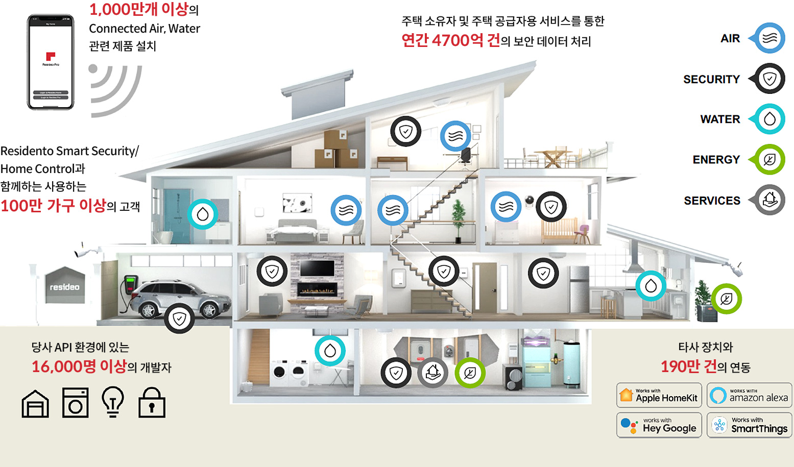 온도조절기부터 보안 및 출입제어, 물 관리 시스템, 심지어 에너지 관리 기회까지 다양한 제품을 통해 주택과 건물 전체를 아우르는 솔루션을 제공합니다.
